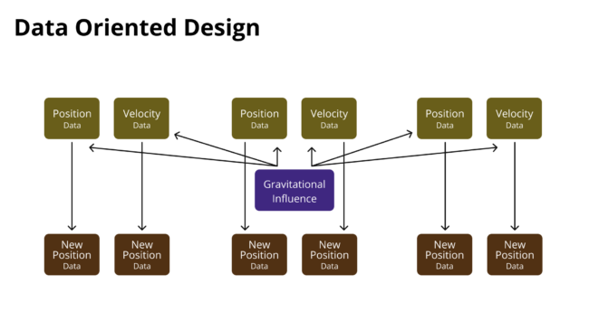 In contrast, data-oriented design focuses on how we transform the data on each object. For example, we know that all objects in the Solar System have a position and velocity, and they’re all influenced by gravity. Each object has different properties, but the math used to find each object’s position and velocity is the same.