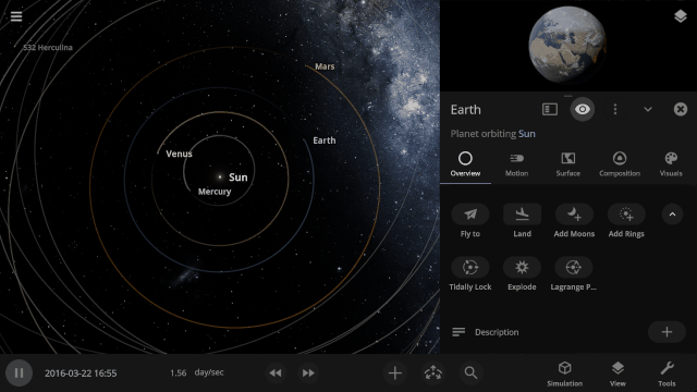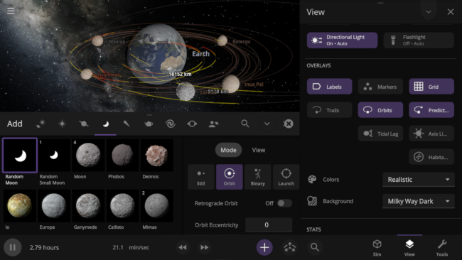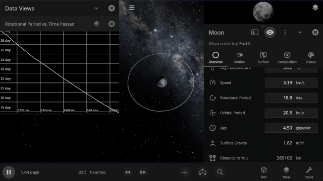 Gravitational interactions that change an orbiting object’s rotational period until the same side of one object always faces the other, as the Earth has done to the Moon, are now simulated. Visualize tidal locking by turning on Tidal Lag in the View panel to see the difference between the object’s orbital and rotational periods.