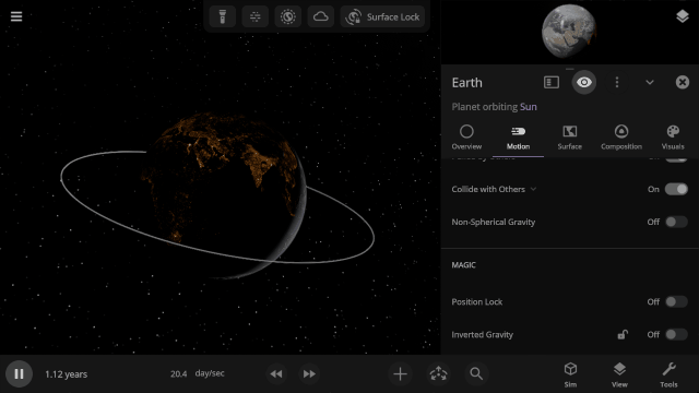 Similar to visually flattening objects, we’re now fully simulating how an object’s gravitational field changes when it’s no longer a sphere by simulating its oblateness factor (also called J2). Previously, these factors, used to simulate the orbits of sun-synchronous satellites, had to be manually entered.