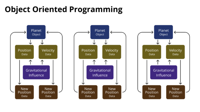 Object-oriented game design focuses on game objects, like Earth in Universe Sandbox. With an object-oriented approach, you take data from an object, like Earth, do something with it, like determine its position and velocity as it orbits the Sun in the next frame, and then apply the data to the object. Typically, this approach works on one object at a time and takes longer when there are more objects.