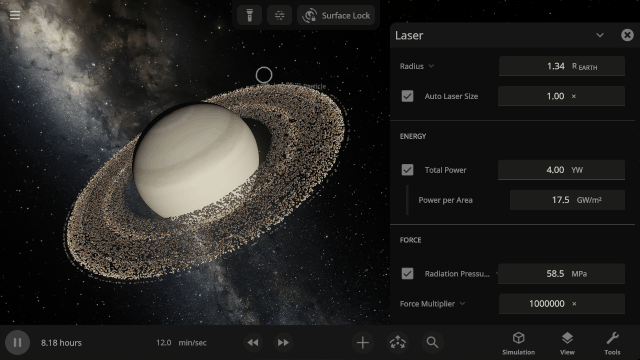 Blast multiple objects at once with the updated laser! Objects will now block the beam from hitting hidden objects. Increase the force from radiation pressure to push planets and their rings.