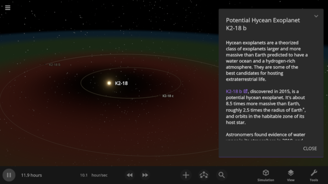 The simulation of exoplanet K2-18 b has been updated to reflect the recent evidence of specific molecules in K2-18 b’s atmosphere that are known to be produced by biological processes on Earth. However, some scientists have argued these molecules may be produced without life, and more data is needed to confirm these molecules are really present in K2-18 b’s atmosphere.