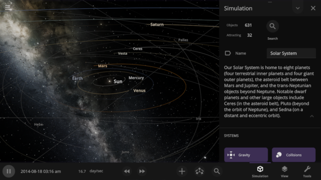 We’ve combined our two previously separate collision methods improving collisions so shockwaves now realistically eject fragments as they spread across gas giants during collisions. Interface panels, such as graphs, data maps, and object properties, are now remembered when you open saved simulations. We’ve also added new astronomical discoveries to explore, like the galaxy-sized detector used to find new evidence of supermassive black holes.