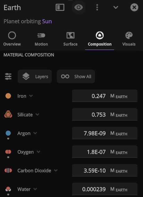 Material colors are based on their real-life properties. Materials blend on the surface of planets and moons so you can watch oceans and gas clouds mix in real time. You can also customize material colors under